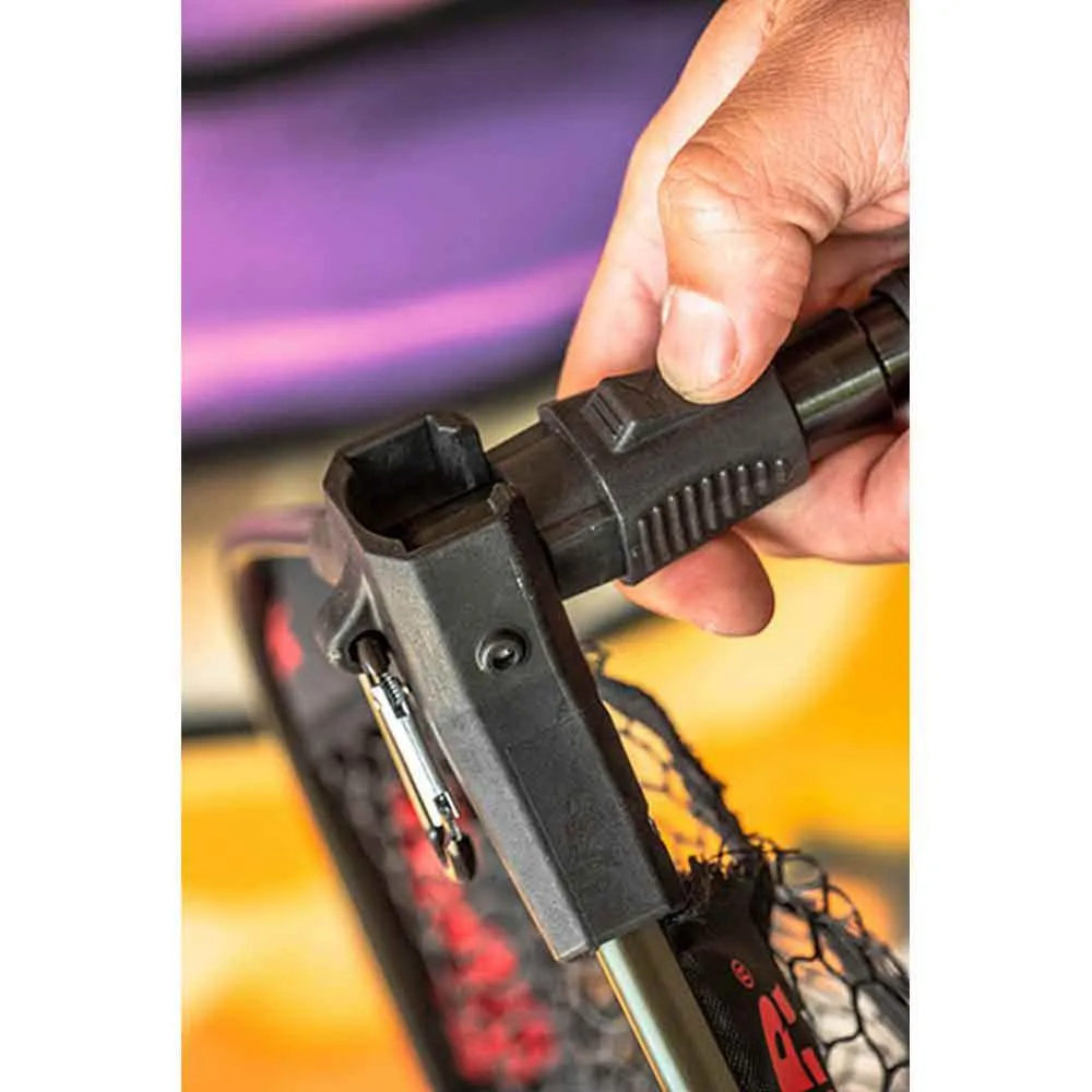 The Fast Net has our own UK-designed net block mechanism that allows you to flick the net into a netting position with just one hand. The spring-loaded mechanism can be opened or closed using just your thumb. The net block itself also features an attachment point either for carabiners or magnetic attachments. The Fast Net Head can be used with any landing net handle with a 3/8´´ BSF universal thread.