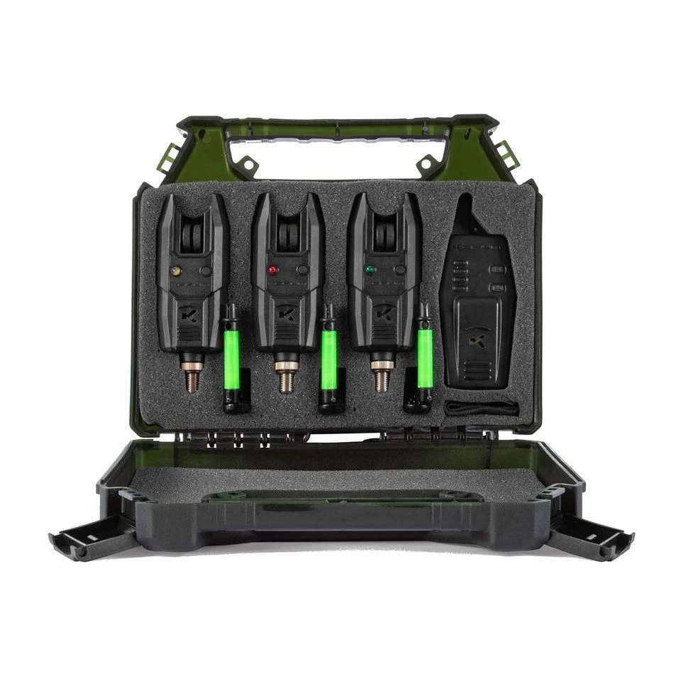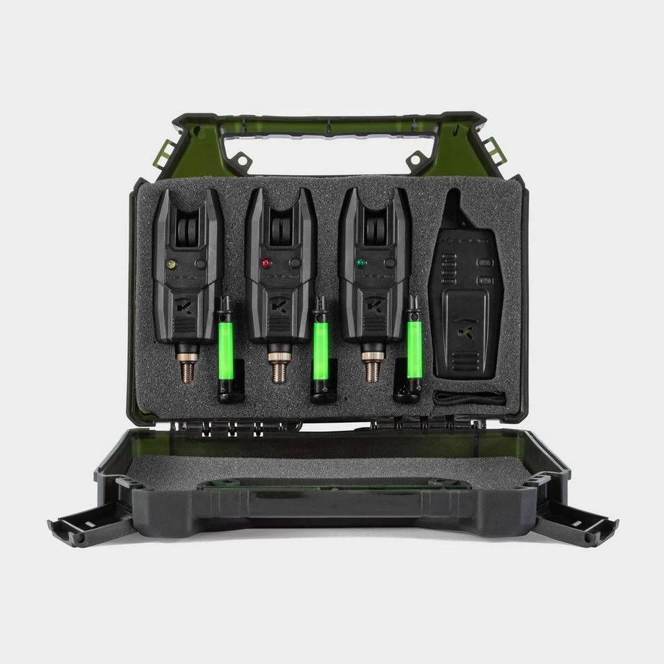 This alarm presentation set contains three alarms and a wireless bite alarm receiver, plus three bright green bite indicators. The KBI alarms are compact, rugged and reliable. Featuring a sensitive roller wheel and a bright LED, it’s a fantastic choice for all forms of specimen angling. The speaker features adjustable volume, while the LED boasts a 10 second alert feature. The receiver boasts a long wireless range, on/off switch and volume control. When used in conjunction with the alarm heads, it’s a top-quality combination that’s not going to let you down.