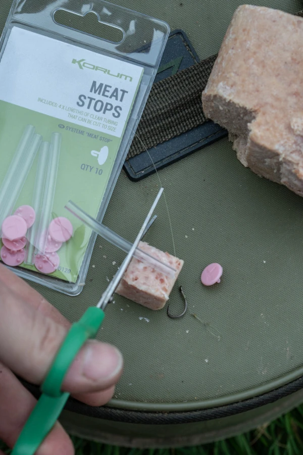 Designed to improve the durability of meat hook baits, the Korum Meat Stops (10pcs) offers a specially designed bait stopper with a number of unique features. For example, the Meat Stops have a large flat surface. The Meat Stops have teeth on the surface so that it hooks securely into the bait. When using the Meat Stops a transparent tube is supplied. This locks the small hook holder in the tube and prevents your hook line from cutting through the meat bait. The Meat Stops are ideal for keeping meat on the hookline in good condition for a long time.